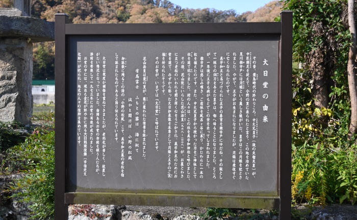 飛鳥時代の終わりに、小野の地を訪れた中大兄皇子(後の天智天皇)、妃の苅姫とその皇子・美宇和王を悼んで、『花山院』に在所の花山法皇が、大日如来像を自ら彫ってご本尊とされたお堂『大日堂』。