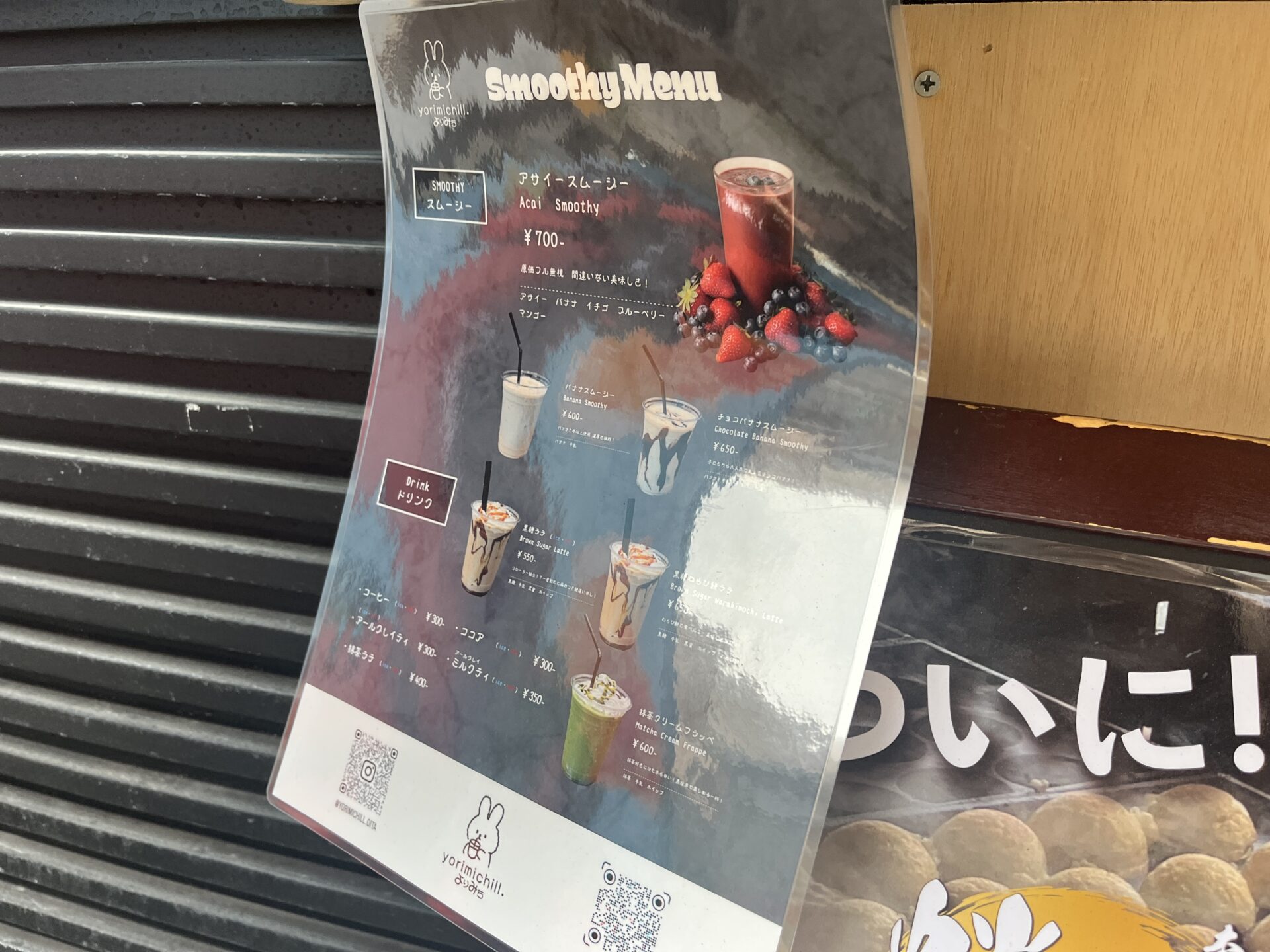 スムージー専門店『yorimichill.よりみち』はアサイースムージーをはじめ、バナナスムージーや黒糖ラテなどのドリンクがあります。