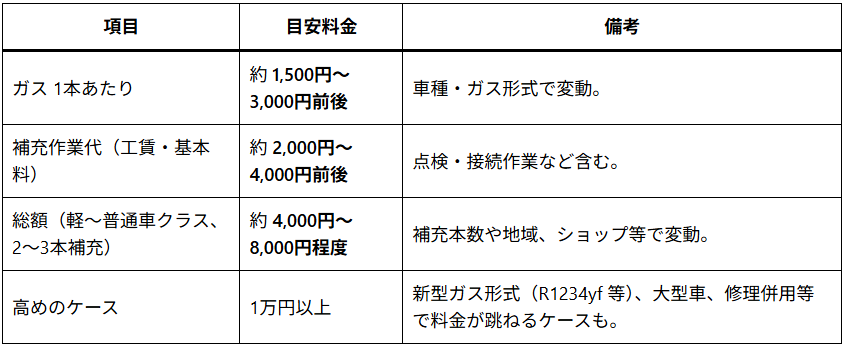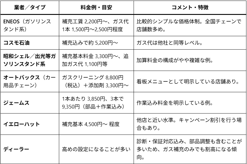 また、「店舗間」「都市部 vs 地方」「車種」「ガス形式(R134a / R1234yf など)」といった変数によって、同じ業者でも料金差が出ます。