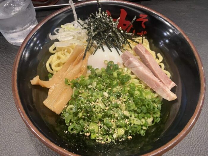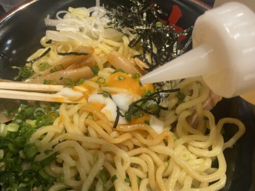 油そば並盛り500円(オープン特価)+スペシャルトッピングA(ねぎごま+半熟卵)180円