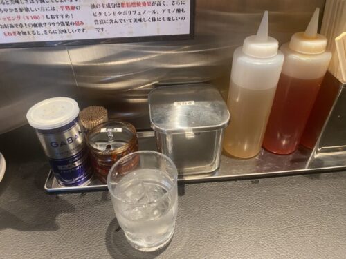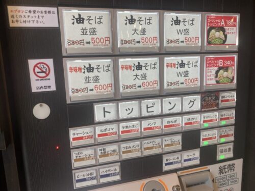 マヨネーズやチーズ、ねぎゴマや半熟卵など(50円〜)のトッピングもここで注文しますが、無料トッピングのすりおろしニンニク、つぶし生ニンニク、つぶし生ニンニクW(ダブル)、柚子こしょうも食券が必要です。※私はすっかり忘れていました。