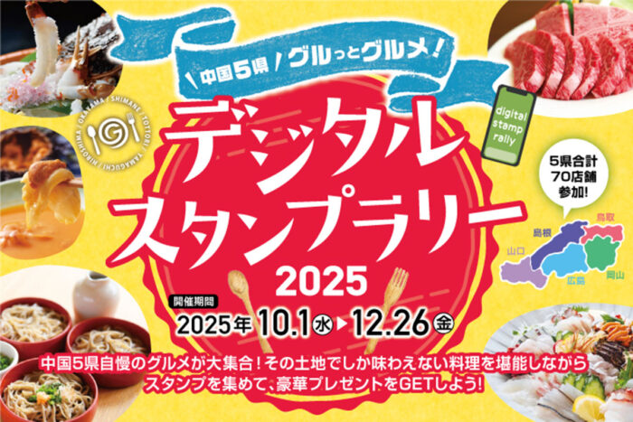 鳥取・島根・岡山・広島・山口の中国5県を舞台に、地域の“旨い”を巡るスタンプラリーイベントとして、「中国5県グルっとグルメデジタルスタンプラリー2025」 が、2025年12月26日(金)まで開催されています。
