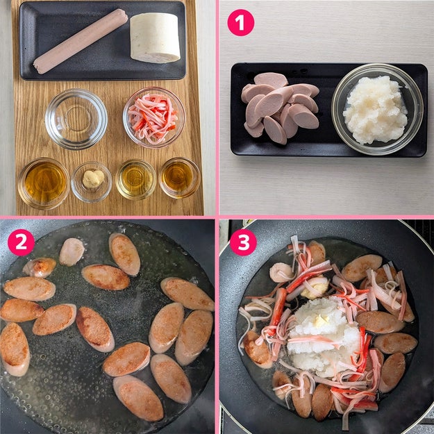 ① 魚肉ソーセージは5mm幅の斜め切りにする。大根は皮をむき、おろして軽く水気をきる。