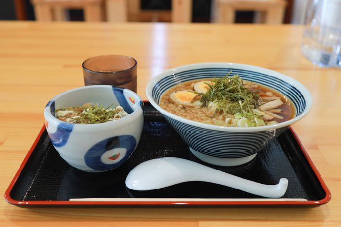 トッピングには、しっとり柔らかく、ほんのり甘みを感じる鶏チャーシューと味玉も添えられていて、全体的にはやさしい味わいながら満足感の高い一杯に仕上がっています。