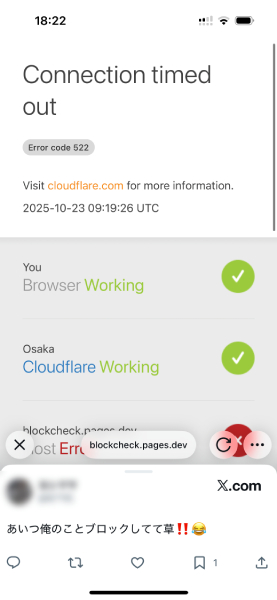 筆者が10月23日18時時点で確認したところ、問題のURL(blockcheck.pages.dev)は「Error 522」と表示され、サーバーからの応答がなくアクセスできない状態となっていました。