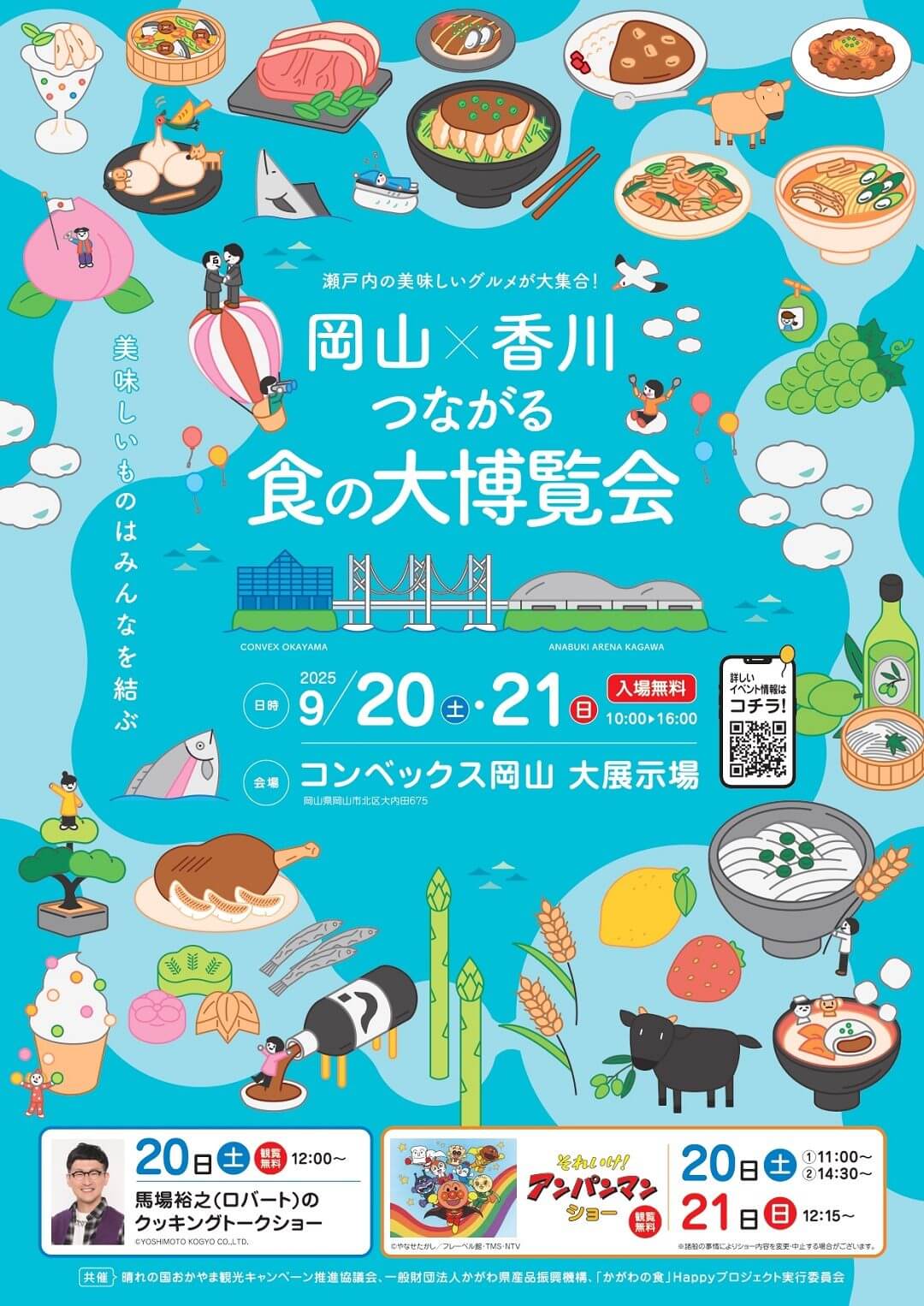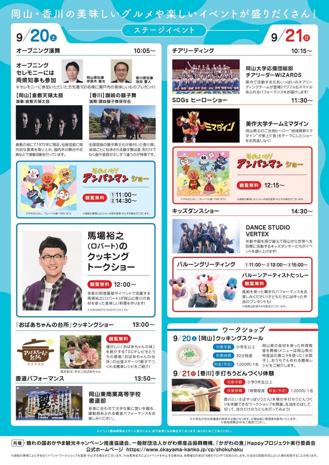 また、ロバートの馬場裕之さんによるクッキングトークショーやキャラクターショー、地元団体によるパフォーマンスなどのステージイベントに、岡山・香川の食材を使うワークショップなど、食の楽しみがぎゅっとつまったイベントです!