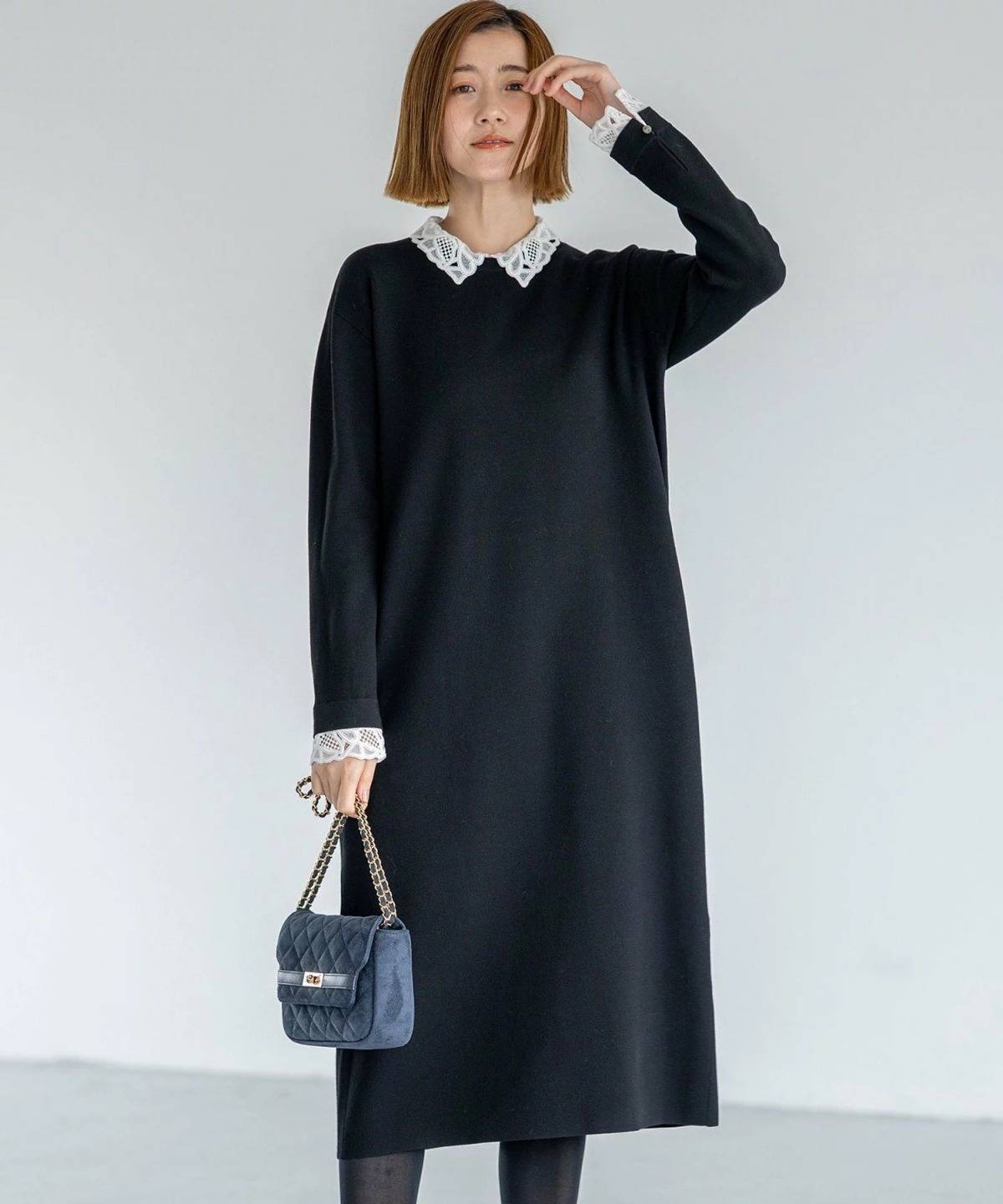 レースの襟とカフスがポイントの上品見えするワンピース。