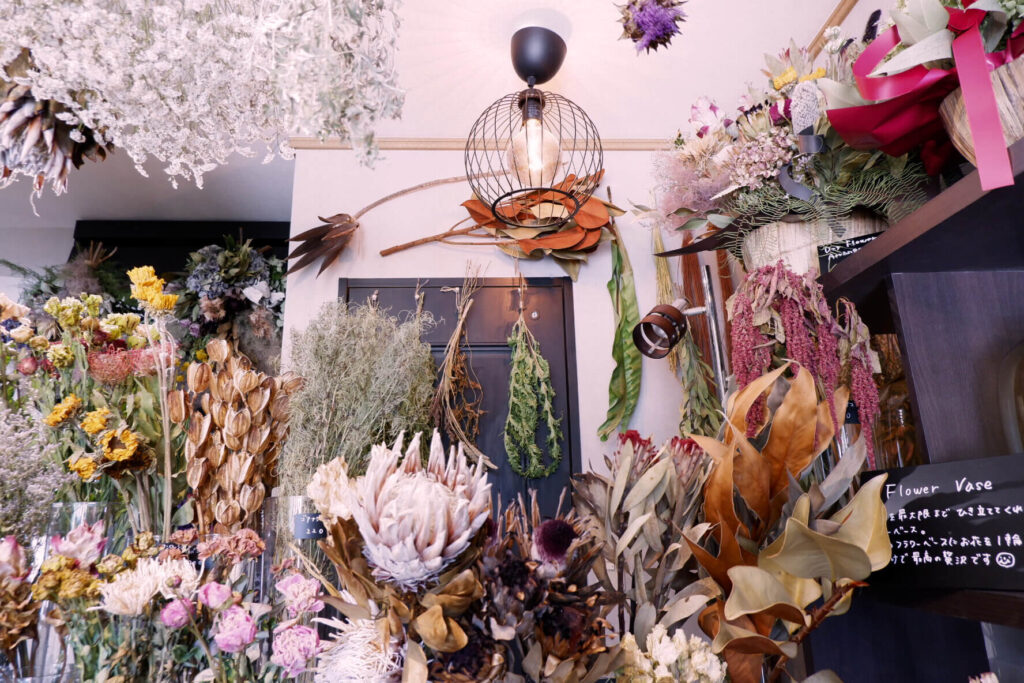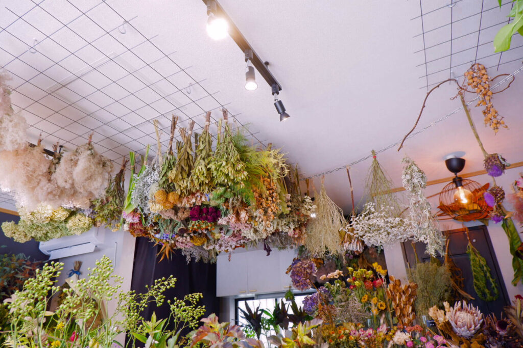 さらに天井を見上げると、そこにも美しい仕掛けが。カラフルなドライフラワーが吊るされ、空間に詩的な奥行きを与えています。