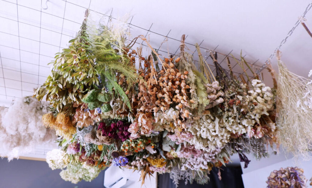 「天井全体をドライフラワーで埋めるつもりなんです。」