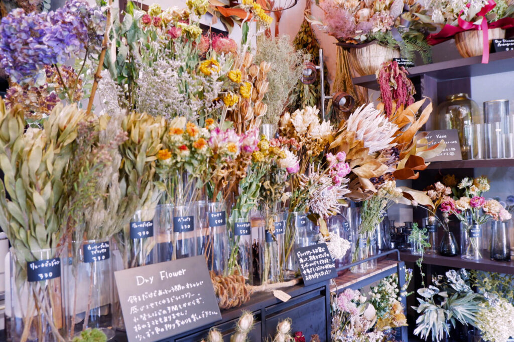 切り花だけでなく、観葉植物や塊根植物、ドライアレンジ、フレグランスボトルやフラワーベースまで──空間全体から、店主である小野大樹さんの“好き”がにじみ出ています。