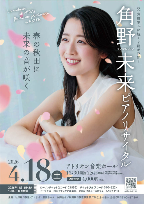 2026年4月18日(土)に秋田市のアトリオン音楽ホールにて、ピアニスト角野未来(すみの・みらい)によるソロリサイタルが開催される。秋田での初公演となる今回は、「春」と「自然」をテーマに、フランス音楽の魅力をたっぷりと届けるプログラムが用意されている。