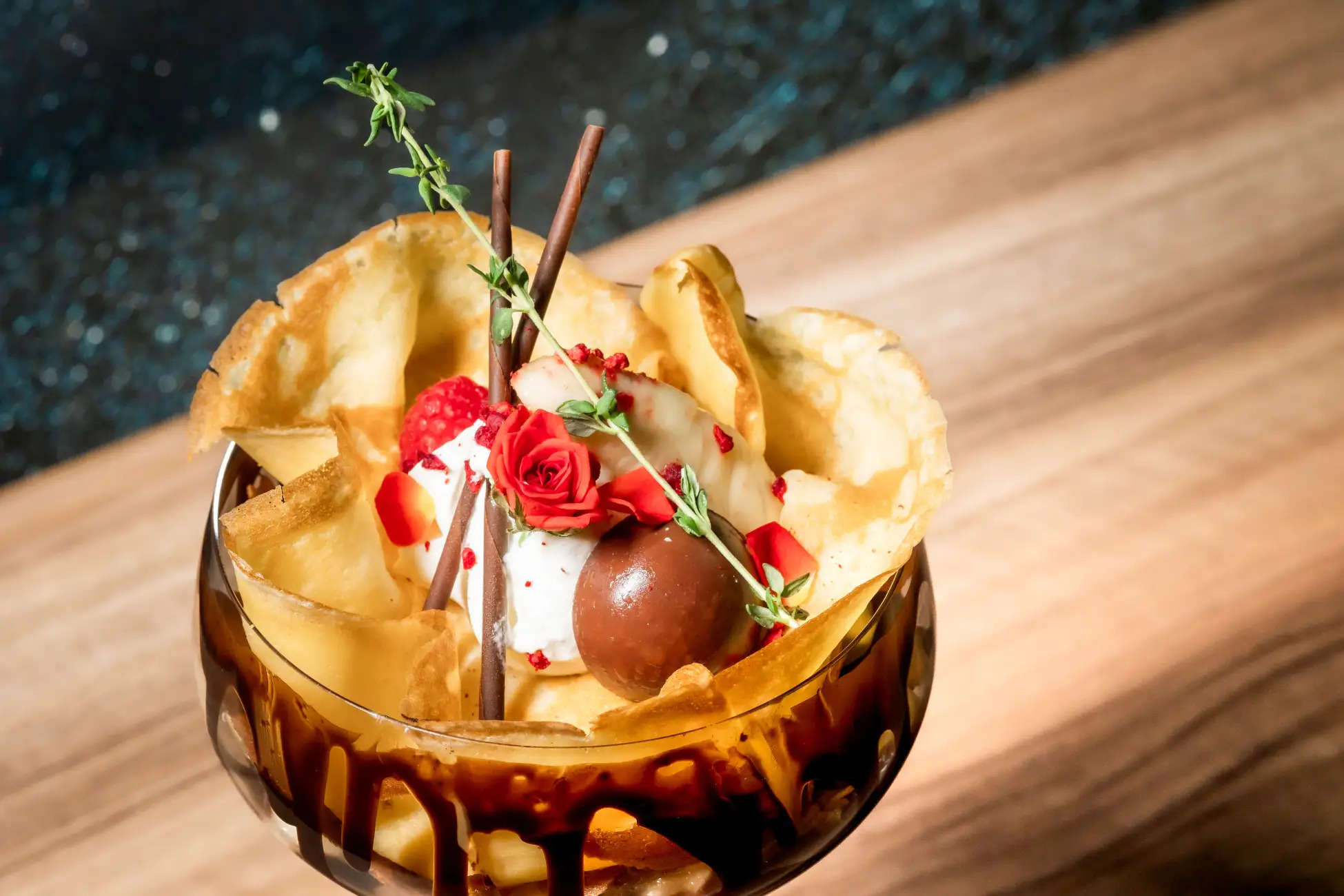 ムース、ブランマンジェ、サクサクのビスキュイ、アイスなど、異なる食感と香りを重ねた層が織りなす、濃厚で軽やかな味わい。