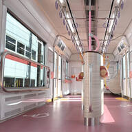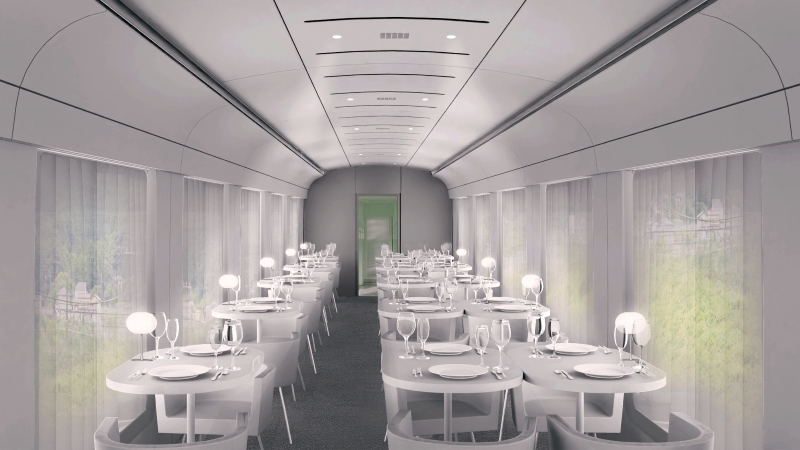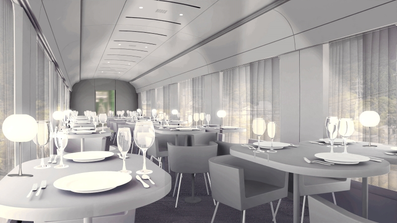 Laviewの特徴である「やわらかく風景に溶け込むデザイン」をさらに進化させ、鏡のように輝く車体となり、沿線の魅力を映し出します。車内はグレーを基調としたトーンで、料理や景色が引き立つようスポットライトやテーブルライトが設置されます。