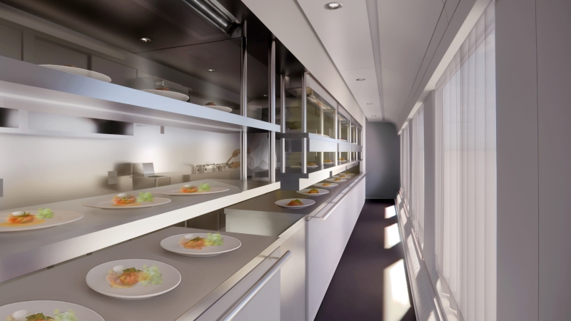 新型列車では、1編成(4両)のうち3号車を1両丸ごと厨房車両とします。この厨房面積は、現在日本国内で定期運行されている列車において「日本一の厨房車両」となるとのことです(2025年9月末時点、西武鉄道調べ)。約70名の乗客全員に温かい料理を熱々のまま提供することにこだわった、大規模な厨房設備となります。