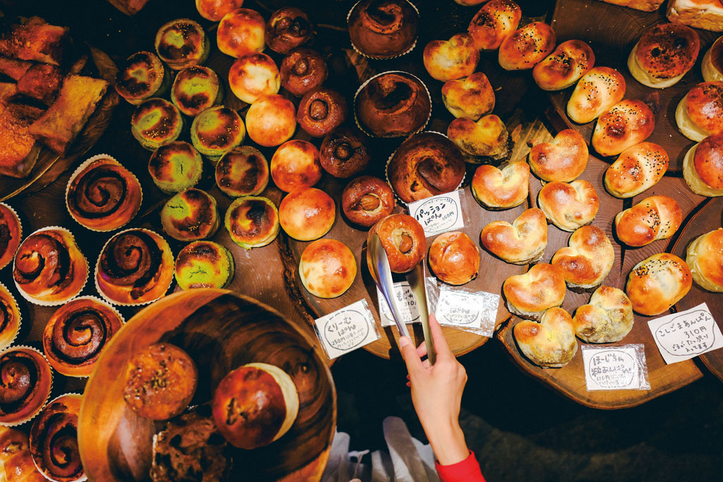 物語の一部のような個性的な外観と、店内に入れば心おどる世界が広がる。その世界観に魅了され、客足が絶えないベーカリー。房の形をした「ぶどうのぶどう」、クリームパンらしからぬ姿の「くりーむぱん」など、つい写真に収めたくなるパンが並ぶ。どれにしようか、あれこれ選ぶ時間も楽しい。