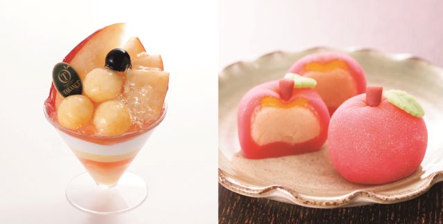 左からフルーツクチュール タカノ「りんごパフェ」(1個/735円)、鶴屋八幡「紅彩果」(1個/476円)