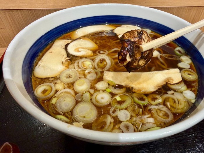 しかし、これぞ秋の風物詩。秋の絶対的王者・松茸様が浮かぶ蕎麦である。恐る恐るひと口すすってみると……なるほど。松茸はほどよくしんなりしていて、噛むたびにザ・秋の味覚が広がる。
