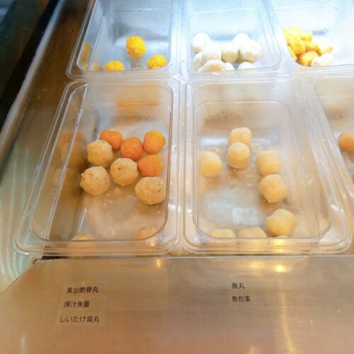 初心者故にどれを選んだものか、店員さんにヘルプを求めたところ・肉は入れたほうが美味しい・野菜は火を通すと嵩が減るので多めでもよい・麺はお好み(だけど自分はコーン麺が好き) ということだったので、 練り物各種(魚包蛋4種・エビつみれ)に鴨血、ラム肉と葉物野菜3種など。 麺は幅広のジャガイモ麺とコーン麺、牛筋麵をチョイス。