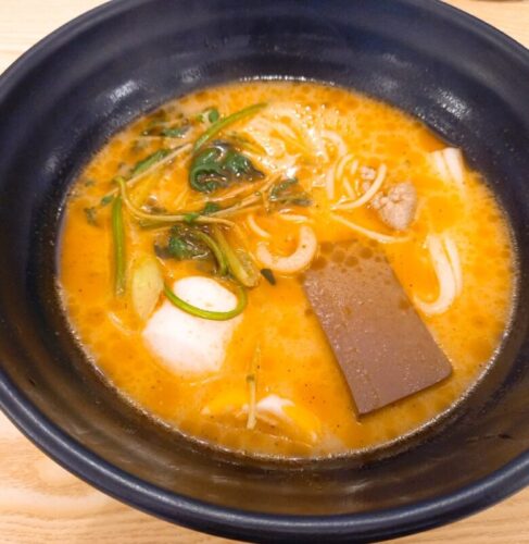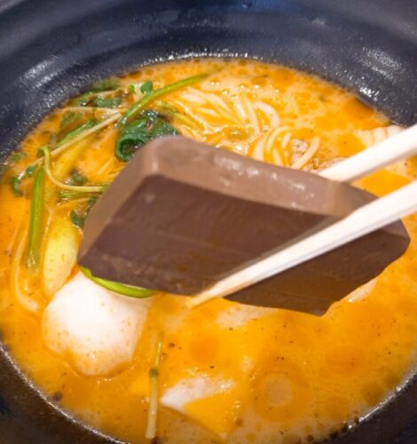 スープは辛すぎず、マイルドなうまみの後にピリッと感が来るかんじ。 お好みで調味料やゴマ、ネギの追加もできます。