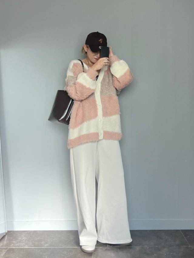 【12月編】センスいいワイドパンツコーデ③カラーブロックカーディガン×スウェットパンツ