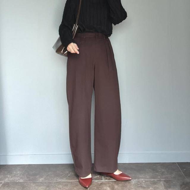ボトムスにブラウンのワイドパンツを合わせて濃色コーデに仕上げれば、センス抜群!