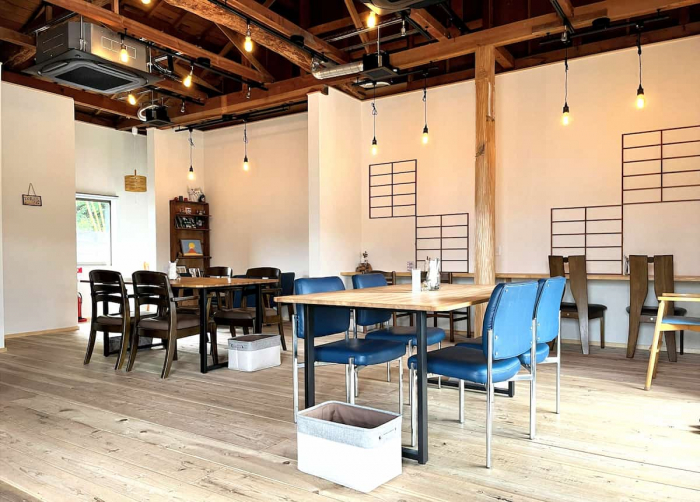 店内は天井が高く、開放感あふれるカフェになっており、市川町と福崎町の間にあります。福崎駅からだと徒歩で18分、レンタバイクなら約6分程度。散歩の途中に立ち寄るのにぴったりの場所です。