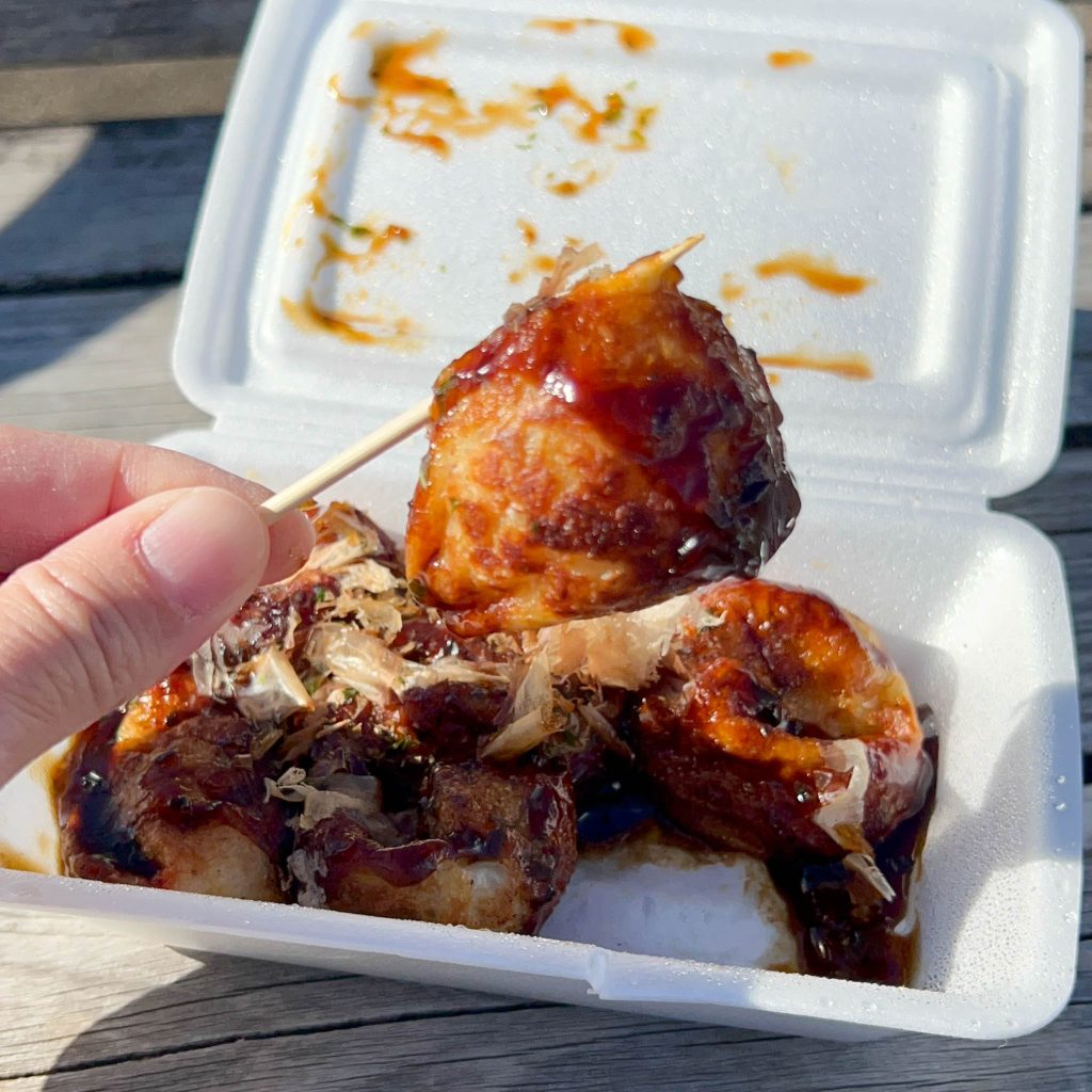 アツアツ出来たてのたこ焼きを受け取り、近くの公園へ移動して実食タイム!