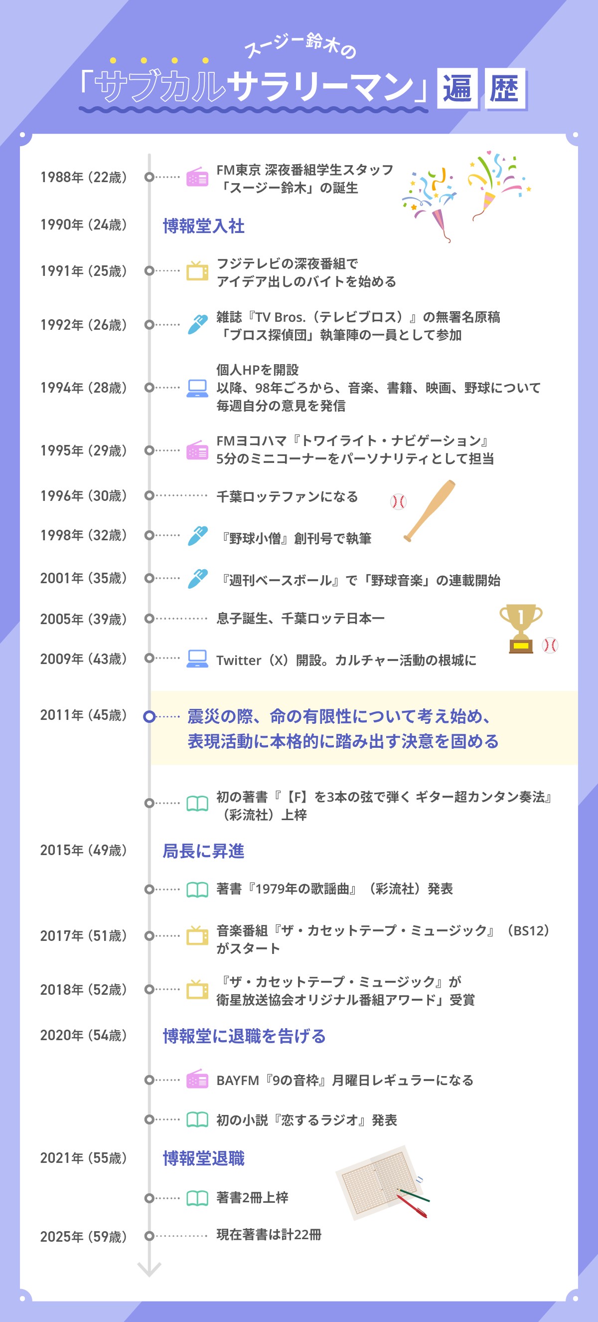 スージー:まあ、そうですね。入社2年目にはフジテレビの深夜番組でアイデア出しのバイトを始め、雑誌『TV Bros.(テレビブロス)』で連載「ブロス探偵団」に執筆陣の一人として参加しました。FMヨコハマでは、5分ほどのコーナーを担当しました。30代に入ってからは野球にハマり、『週刊ベースボール』で音楽と野球をテーマに連載を持つなど、本業の傍ら好きなことを形にしていきました。
