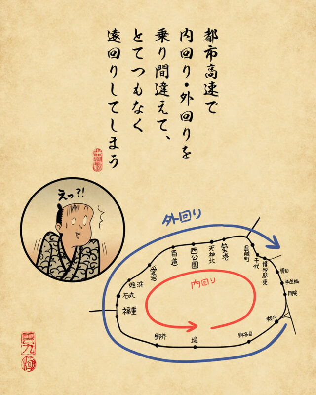 天神や博多から目的地へ向かおうと高速に乗ったのに、うっかり内回りと外回りを間違えると、とてつもなく遠回りしてしまうことに…。