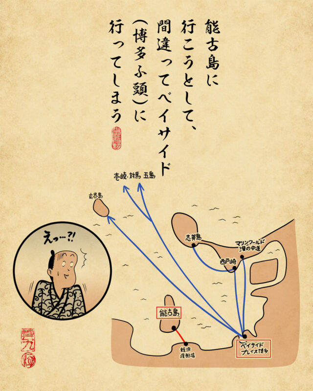 特に「能古島に行こう!」と思って博多ふ頭に行ってしまうと、気づけば志賀島行きの船に乗ってしまい、意図せず別の島の観光を楽しむことに…!まさに福岡ならではの交通あるあるです。