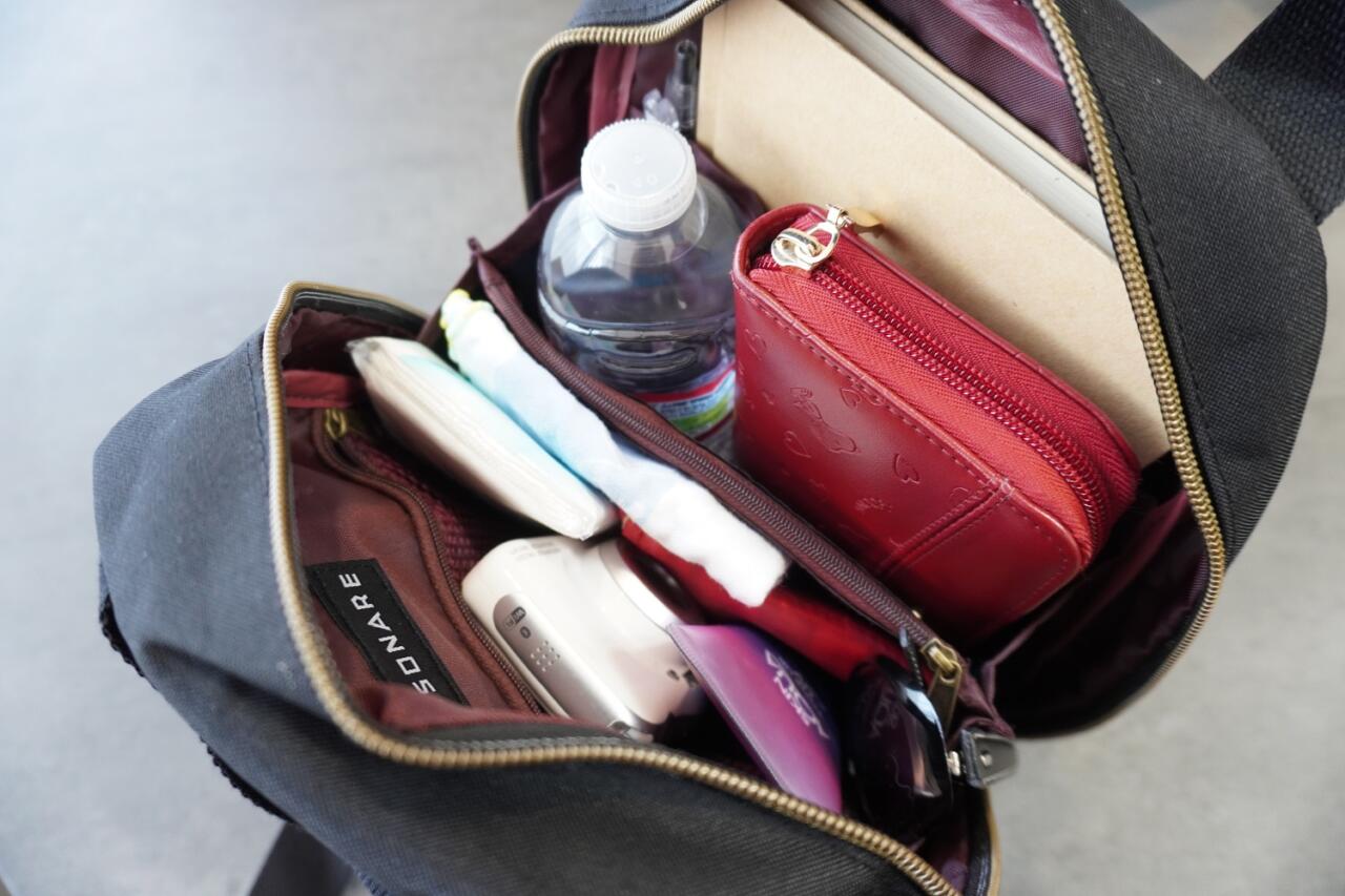 お出かけに必要な荷物を入れてみました。お出かけの時に持ち歩きたいアイテムは一通り入りそうですね。