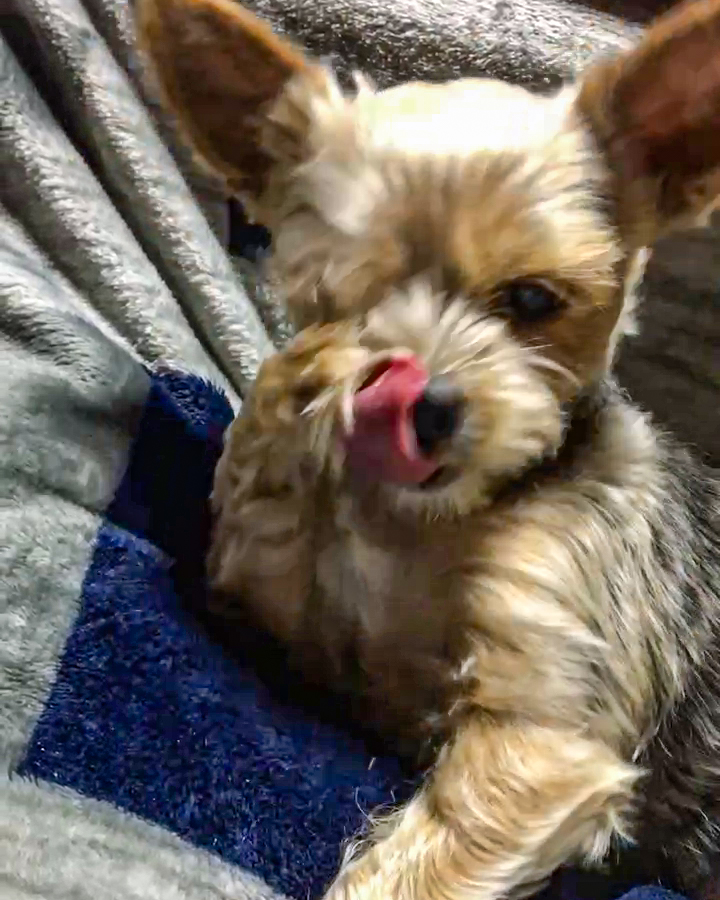 犬なのに、猫のように一生懸命顔を洗うらんちゃん。