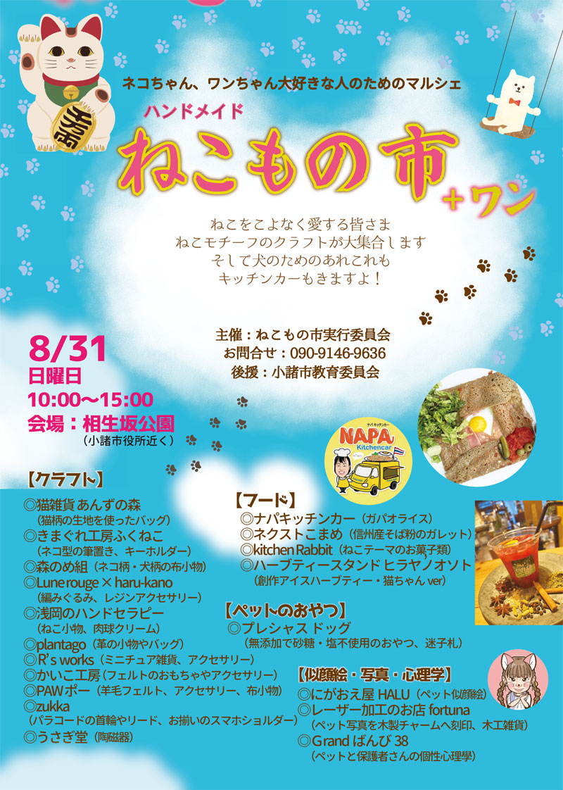 8/31(日)ネコ好き&イヌ好きのためのマルシェイベント『ハンドメイドねこもの市+ワン』ネコ・イヌ雑貨、ペットのおやつ、飲食店など約20店が集結@長野県小諸市