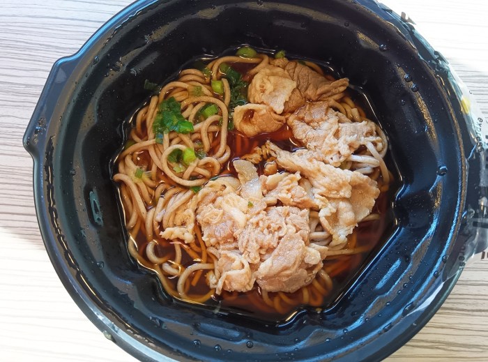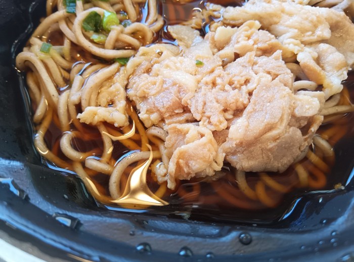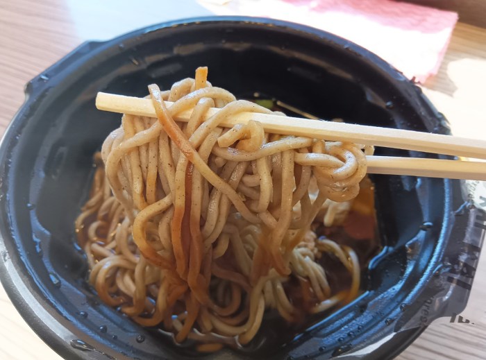 ちなみに、私が注文したのは豚肉そば。食べてみると、甘めのつゆがコク深い。レンチンを想像する見た目なので、風味はあまり期待してなかったけど、意外にもそばの風味がしっかりしている。