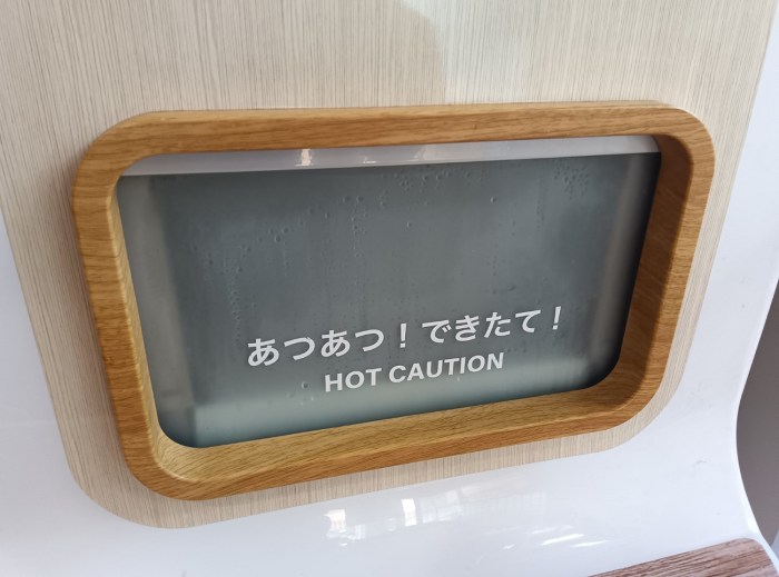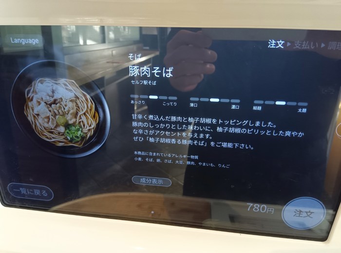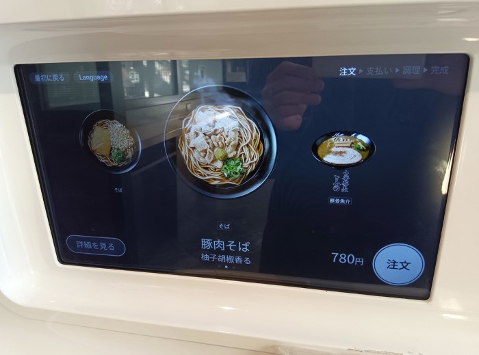注文は自販機の中央についてるタッチパネルで行う。展開されていたメニューは3つ。「たぬきつねそば(税込600円)」「豚肉そば(税込780円)」中華蕎麦とみ田の「濃厚豚骨魚介ラーメン(税込980円)」である。