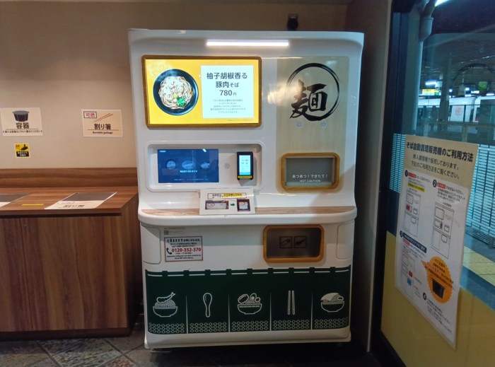 ガチで無人駅そばだった『セルフ駅そば』。登場時のテレ朝の記事によると、この自販機はアメリカ・シリコンバレーにあるベンチャー企業が開発した販売機なのだそうな。風情を重視する駅そばマニアはさて置き、従来の駅そばよりゆったり食べられるこちらの方が好きという人も多いかもしれない。