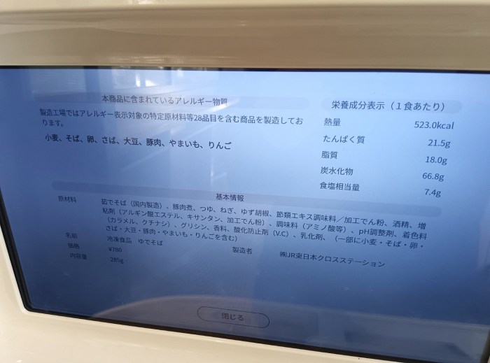 その詳細ページの下に表示された「成分表示」のボタンをクリックすると、商品に含まれるアレルギー物質など素材の情報が表示される。情報的な面では普通の駅そばより親切だ。
