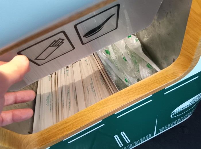 この取出口の下に箸とスプーンの入ったストックがある。文章で書いたら迷路みたいだけど、まあ見たら考えなくても分かるくらいの配置だ。