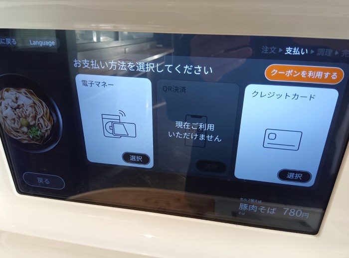 支払いは電子マネーかクレジットカード。タッチパネルの右手に決済端末がついてるのでそれで決済すると……