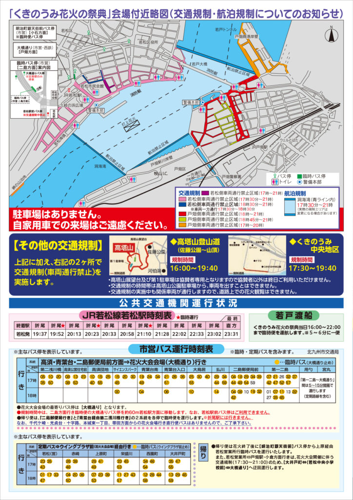 若松側:JR若松駅から徒歩3分 戸畑側:JR戸畑駅から徒歩5分 若松周辺は17:30〜21:00まで車両通行禁止(一部異なる区域あり) 高塔山登山道は16:00〜19:40まで通行規制