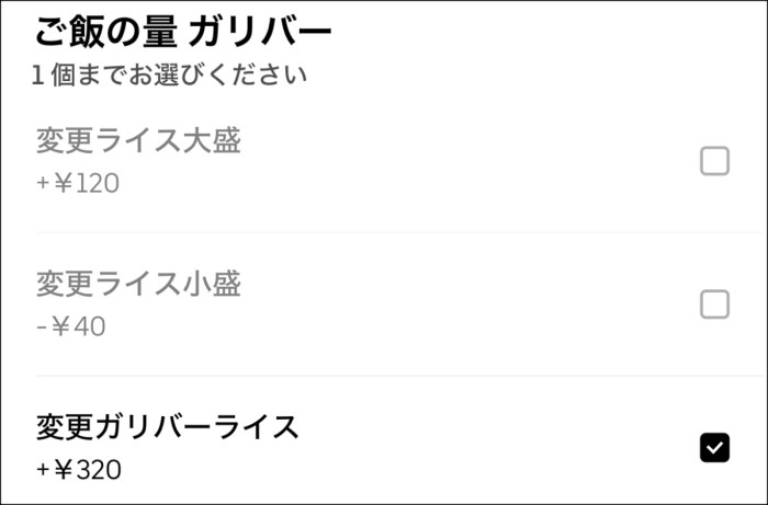 価格は税込3380円となかなかのガリバーぶり。プラス320円でガリバーライスに変更できるというので、あまり意識せずチェックを付けて注文を確定した。