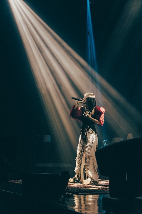「ツアーファイナル、あっという間でしたね。初のZeppです。叫ぶなり、ジャンプするなり、歌うなり、最後まで楽しんでいってくれたらなと思っています」という彼女の言葉に完璧に応えた空間が、その後も作り上げられた。ダンサブルなビートを躍動させた「delulu」を経て「HEART BEAT」に突入すると、ますます開放的に身体を揺らした観客。ソファが置かれていて、数個の室内灯が橙色の光を放っているステージ上は、穏やかなリビングルームのような雰囲気を醸し出している。ハンドマイクでステージ上を自由に巡り、時にはソファに座りながら歌った彼女は、「New Style」「劣り」「ジェラシー」も次々披露した。