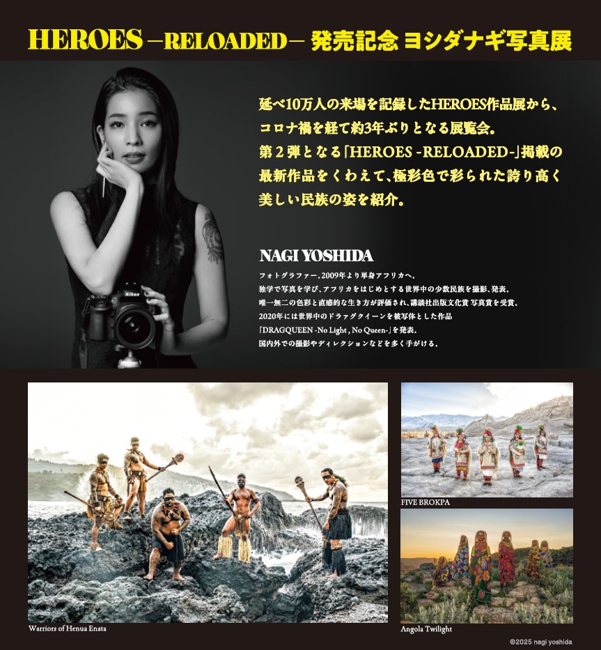 —今回の写真展は「HEROES ―RELOADED―」というタイトルになっていますが、このタイトルに込められた意味と展覧会の内容について聞かせてください。 タイトルの「RELOADED」は続編とか、フィルムを再装着するっていう意味があるんです。コロナ禍で活動期間が空いてしまって、コロナが明けてからまた旅に出て彼らに会いに行こう、ということが起点になって作った写真集なので、そのようなタイトルになりました。 —同名タイトルの写真集も発売されていて、その作品を携えて日本各地で展示をしているという形ですね。ヨシダさんのステートメントには「幼い頃から少数民族に恋焦がれた」とありました。ヨシダさんが被写体にしている少数民族の方々に惹かれる理由を教えてください。 幼少期の頃にテレビで見て、本当に純粋に「こんなにカッコいい人たちがいるんだったら、こうなれたらいいな」って思ったんですよ。子どもが「仮面ライダー」とかに憧れるような感覚があって。それがきっかけです。 テレビでマサイ族の姿を初めて見て、まだ「マサイ」っていう名前についてもちゃんと分かってなかったし、マサイの人たちが海外から来たということすら全く分かってなかったんですが、「こうなりたい!」という思いは強くありました。