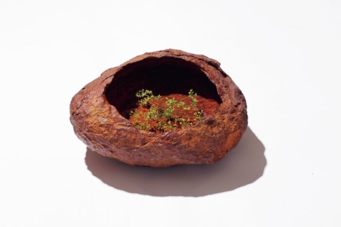 現在では採掘が禁止されている京都の鞍馬石。昔から日本庭園や茶室の庭で使用され、「侘び寂びの石」と呼ばれてきた。この錆びた色は石に含まれる鉄分が酸化した自然の経年変化。本来は小さな「つくばい」として作られた。