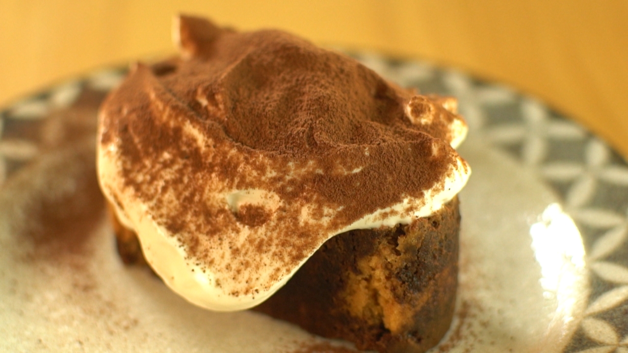 下の部分のビスコッティは自家製。そこに、店で抽出したエスプレッソを染み込ませた香りのよい1品です。
