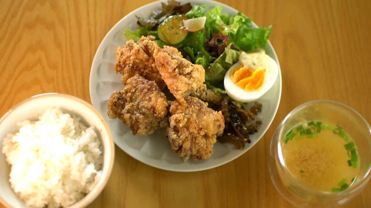 この日は唐揚げとサラダのプレートにスープ、そして、新米のコシヒカリでした。