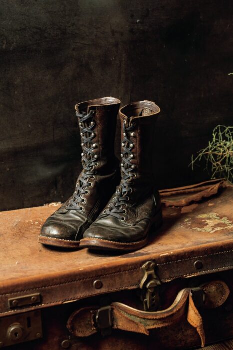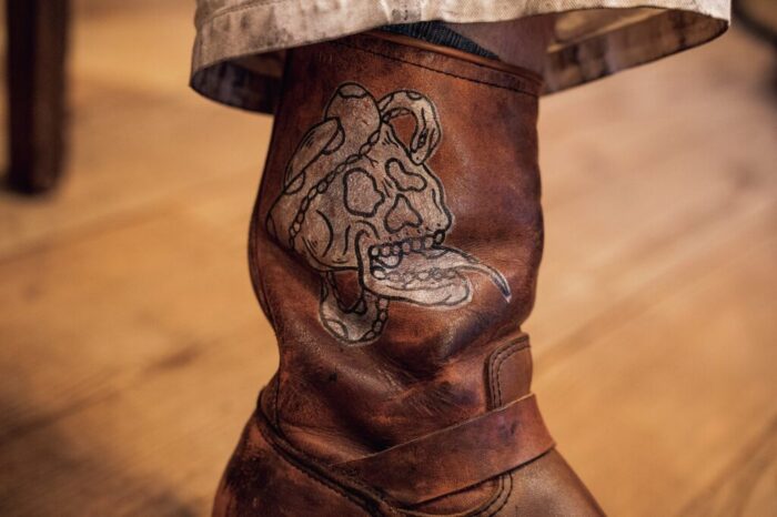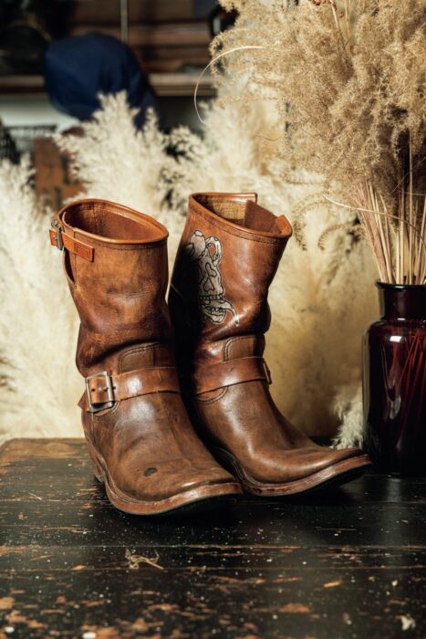 BRASSの10周年を記念して極少数のみ生産されたCLINCHのカスタムブーツ。シャフトにヴィンテージのRED WINGを用いて、アッパーやソールはCLINCHで製作。シャフト部分には、NUTS ART WORKSのハンドペイントが入るというスペシャルな仕様である。「RED WING関連のブーツでもっとも思い入れがあります。あえて小さなサイズのシャフトを選んでいます」