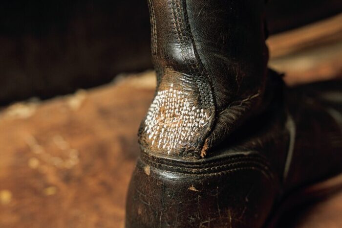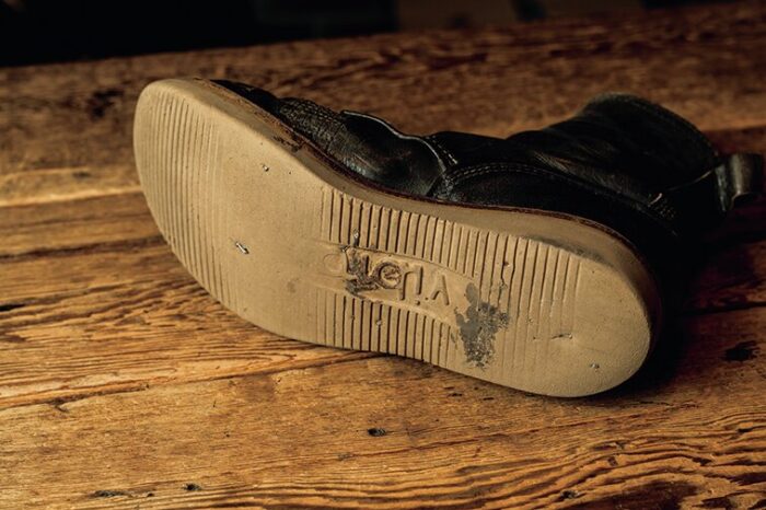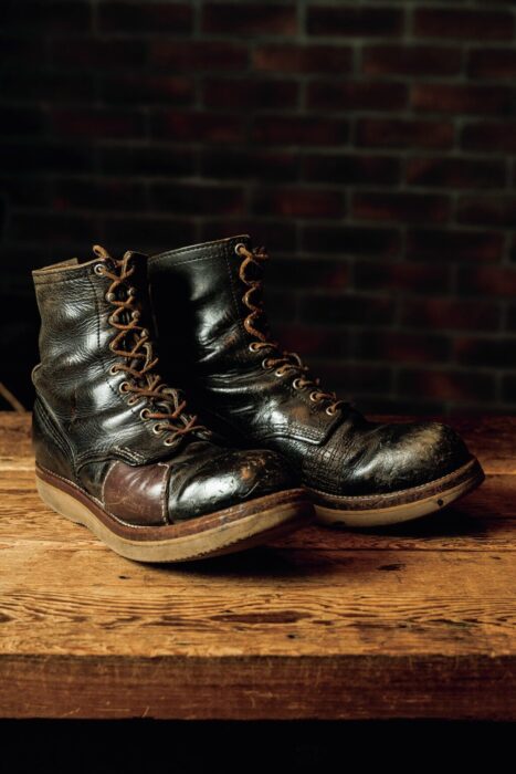 品番やモデル名は不明であるが、1950年代頃のラインマンブーツだと思われる。ヒール部分にダメージがあったため、ワークウエアのリペアのような感覚で補修したサンプル。ソール交換している。