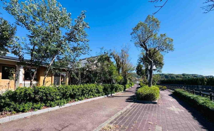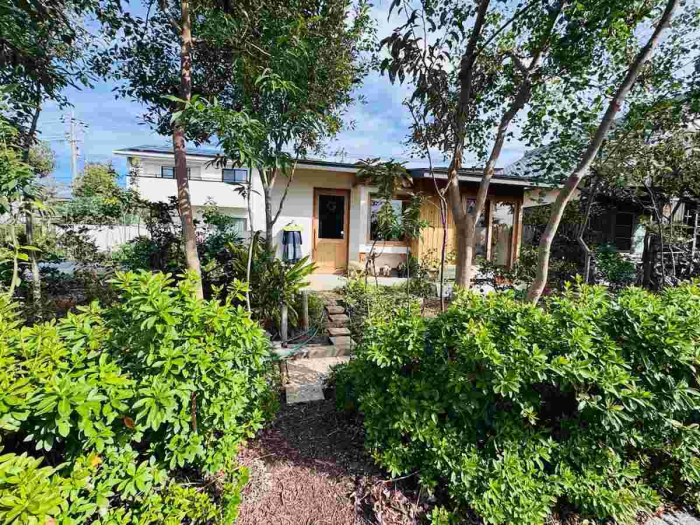 遊歩道横の住宅の中にナチュラルでひときわ明るい素敵な平屋の建物。つながる細い道の先に見えてくるのは…