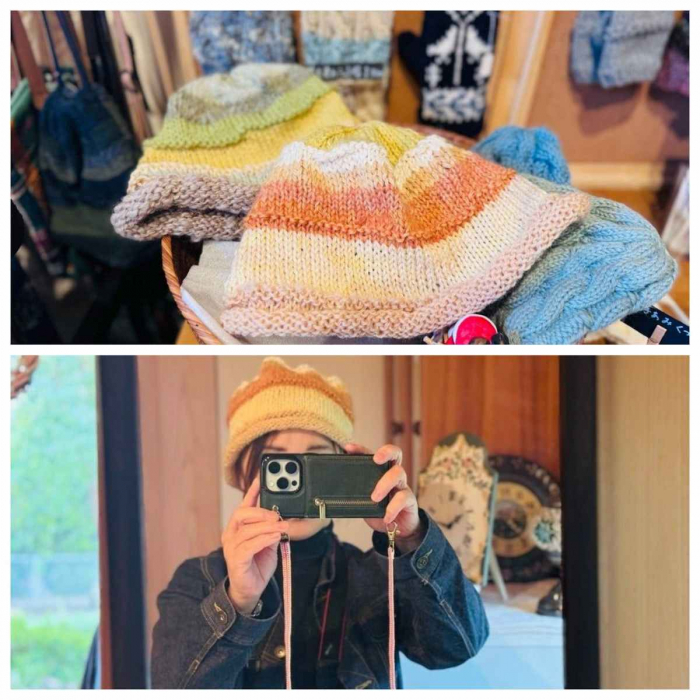 素敵なニットの帽子があったので試着してみました。どうでしょう~、かわいいですよね♡ほんわかあったかくてこれからの季節にちょうどよさそうです。